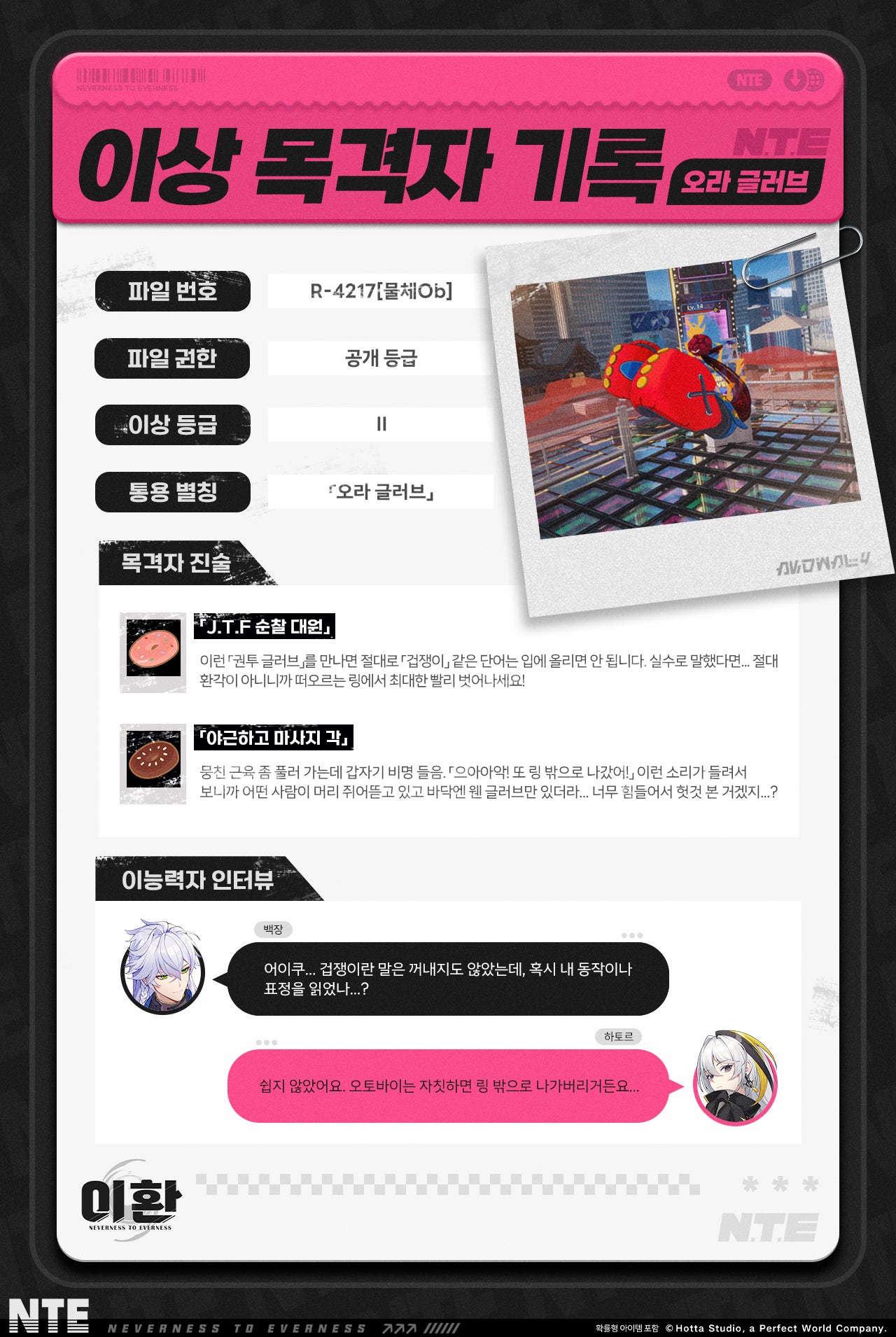 후미진 뒷골목, 코트 위, 파티장... 오늘도 헤테로에는 어김없이 어디선가 묵묵히 다음 도전자를 기다리는 글러브가 있다... 이번 이상 목격자 기록에서는 오라 글러브에 관해 알아보자. 「감히 나를 겁쟁이라고 불렀겠다? 자신 있으면 한 판 붙어!」 안녕하세요, 헤테로 시티에 오신 것을 환영합니다!