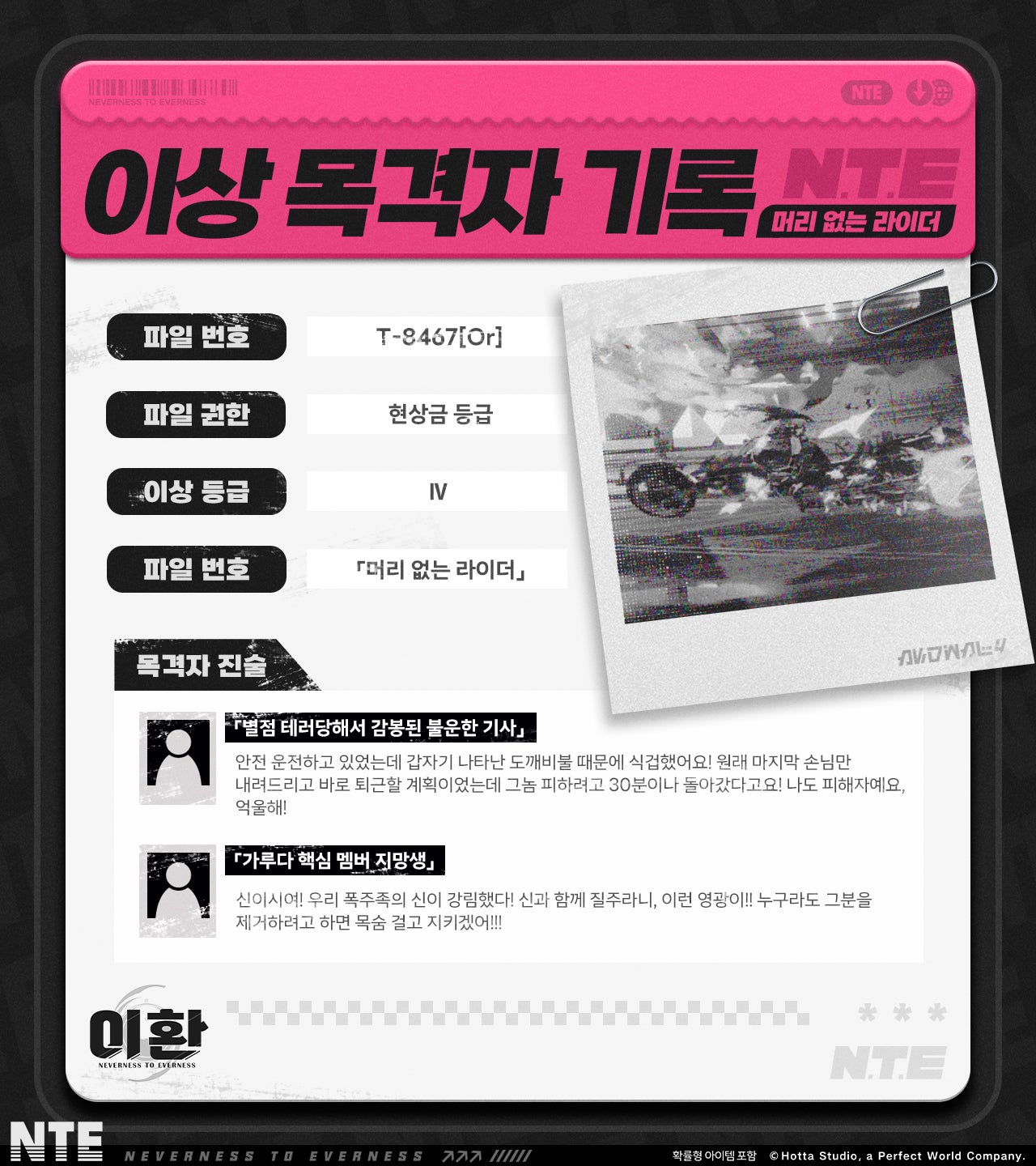 헤테로의 평범한 하루를 특별하게 만드는 기록, 당신이 모르는 이상의 뒷이야기를 파헤친다. <이상 목격자 기록>, 절찬 발행 중! *P.S. 본지는 시민 제보를 바탕으로 작성되었으며 공식 입장을 대변하지 않습니다. 사실이 아닐 경우 법적 책임을 물지 않습니다. 한밤의 거리를 스치는 파란색 불꽃, 잠든 도시를 뒤흔드는 수상한 굉음. 도시의 무법자인가, 질서의 수호자인가? 목격자 기록에서 함께 알